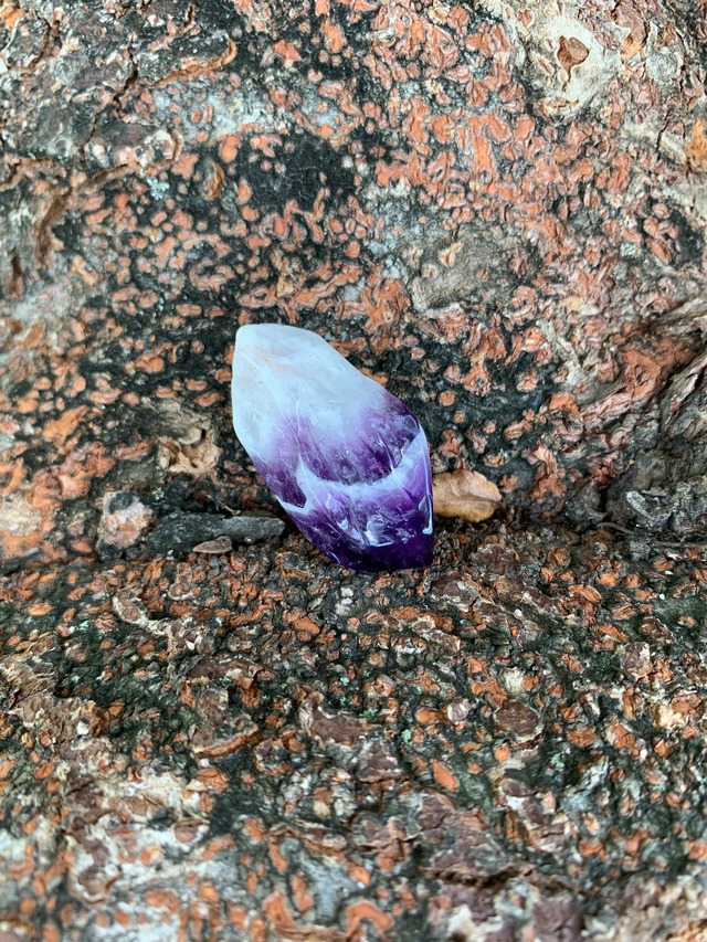 アメジスト。 絶妙な魅力的な形であり、研磨もされてツヤがあります。透けて見える箇所があるのがお分かりいただけますでしょうか。持ち歩きにも良いサイズで、グリッドにも。 感情を鎮めて心に平和を与え、精神の安定をはかる効果があると言われています。 不安やストレスを取り除き、穏やかな気持ちにさせてくれるでしょう。 「真実の愛を守り抜く石」とも呼ばれる通り、恋愛成就にとても人気の高い石です。 非常にスピリチュアルなパワーが高いとされていますので、恋愛だけでなく厄除けやクリエイティブな仕事をしている人のお守りとしても人気です。 産地 ブラジル サイズ約 4.5cm×2.1cm×1cm 重さ約 12g