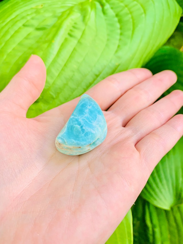 ブルーアラゴナイト。 ジオード(内側が空洞)になっていて、内側がキラキラと輝いています。 ブルーアラゴナイトは、揺れ動く感情のバランスをとり、心の奥底に隠されている本当の気持ちを表に出すサポートをしてくれる石だといわれています。 「エネルギーの浄化をおこなう」という石言葉を持つこの石は、負の感情を開放しポジティブなパワーに変換するとともに、落ち込んだ心を優しく包み込んでくれるのです。 特に、ナイーブになってしまう誰にもいえない悩みや、人間関係の苦しみがあるとき、ブルーアラゴナイトの持つ優しい癒しと、ストレス解消のパワーが効果を発揮します。 また、ブルーアラゴナイトは、これまでの経験からくるストレスやプレッシャーに対して「それらはすべて過去のことである」と教えてくれます。 産地 アフガニスタン サイズ約 3.8cm×2.1cm×厚さ1.9cm 重さ約 22g