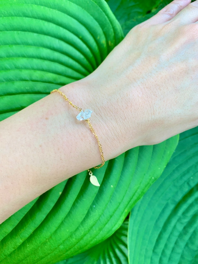 ハーキマーダイアモンドのブレスレットです。 こちらは、もう1点と比べ、ツインになっているハーキマーダイアモンドが大きいです。 世界で一番美しく、輝きが強く、硬度も高いと言われているハーキマーダイヤモンドの原石クリスタルです。とってもパワフルな波動があると言われています。 ハーキマーダイヤモンドはクォーツ(水晶)の一種ですが、形や効果の面から「ドリームクリスタル」の別名をもったパワーストーンです。この石を持つと持ち主に鮮やかな予知夢や夢からの重要な気づきを与えると言われています。また「種」のような姿から、持ち主の「希望の種」や「才能の種」を開花させる力も持っています。 産地 NY州ハーキマー鉱山 サイズ約 天然石9mm×5mm ブレスレットの長さ 19cm(2.2cmのアジャスター付き) 素材 14kgf